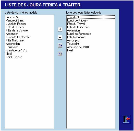 Dans cet écran la liste de gauche contient tous les modèles de jours fériés, la liste de droite contient tous les jours fériés qui devront êtres calculés automatiquement.